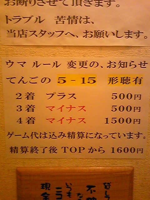この日は夜半まで甲府で仕事があり、翌日早朝に東京だったので、家に帰らずに麻雀打って時間を潰した。16-18時の来店だと300円もらえるのだが、深夜0-2時に行っても同様のサービスを受けられるとのこと。現金カゴにその300円と1000円のチケットの計1300円が入った状態でゲームスタート。