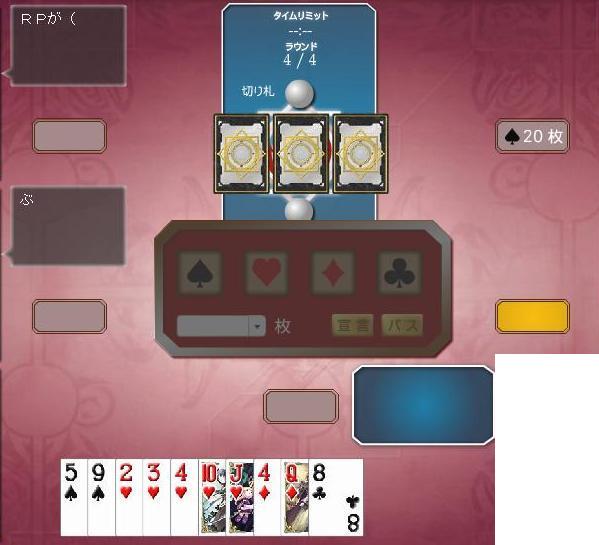 ナポは役札はジョーカー、正ジャック、裏ジャックと総持ちだったものの、切り札自体は正ジャックを含む3枚しかなかった。なので俺の2回目の切り札で正ジャックをあぶってしまい、その後はナポ軍が主導権を取れず結局敗退した。 試合後、ナポに「副官が俺の切り札を刈りまくったから負けた」とかチャットで打たれた。切り札刈りなんて基本戦術だろ。されたくないんだったらお願いマイティにしろセイム2しろ、副官である俺に主導権を渡さなければいいだけのことだし。 最近ナポの接続人数が少なくなっているのが分かる気がする。