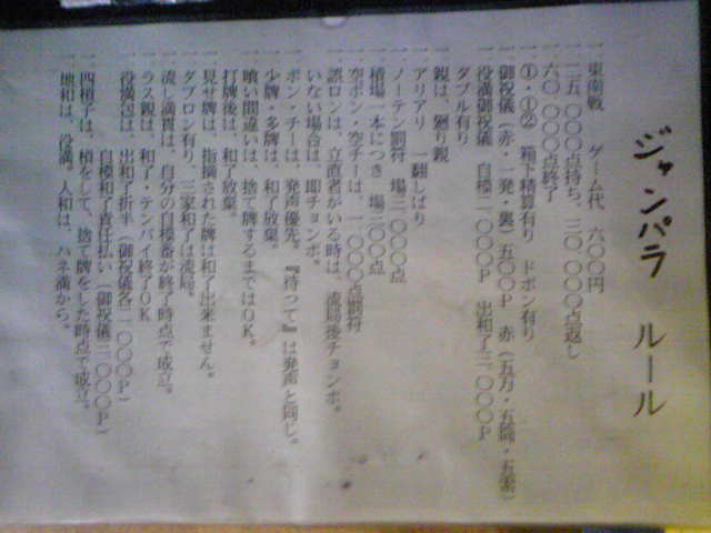 ということでジャンパラ初参戦。日曜の夕方18時頃に行ったが卓は立ってなかった。聞くところによると週末はいつも21時ころから客が来だし、昼前まで卓が回るとのこと。18時だとちょっと早いようだった。 出直そうかと思ったが、メンスリーで卓を立ててくれることに。6半荘だけ打っていった。 メンバーはみな高齢で麻雀経験の豊富な人ばかりだった、その人たちに最近麻雀をろくすっぽやっていない俺がかなうはずも無く、ボッコボッコ刺さった。いちおう2回はトップがあるが、1回は僅差、もう1回はリーヅモチートイ表表裏裏の貯金で勝つという、まぐれ勝ちのもの。 そのメンバーだが規制は結構厳しくあるようである。とりあえず口に出していたものだけでも「東場は鳴いて3900無いのはダメ」「オーラスの3位4位確定上がりはダメ」など。さらには卓内でのタバコも禁止なようである。(俺はタバコを吸わないが、吸わない人がいる場合限定かもしれないが。)それだけのハンデをもらっておきながらのこの成績だが、相当衰えていると言わざるを得ない。レートもピンだしおいそれとは行けない店のようである。 近所にあるラーメン屋が別のところに移転した。その跡地は空き店舗となっていたが、最近「麻雀、1人でも遊べます」という張り紙が張られた。とりあえずフリー雀荘っぽい感じだったので行ってみた。 するとメンバーは甲府の店で何度か見かけたことがある人ばかりだった。聞いたところによると、石和のドラえぽんをたたんでこちらに移転したんだそうだ。場所は国道139号バイパスのマックやすきやのある交差点。最寄駅は富士吉田か富士急ハイランドだが、歩くと30分はかかる。店名は「ジャンパラ」。 ルールは普通のアリアリで1-1-2(1-1-3だったかも)。鳴きチップで1枚500円。店独自の役みたいなものはない。 根強い完先文化のある富士吉田で、いよいよアリアリの店が出来た。今後どうなっていくのか、気になるところである。ちなみに麻雀マジックアカデミーの県内の名門校は河口湖のバッティングセンターらしい。 先日のナポ。トップ目で向かえたオーラス。 ▼が2やジャックを含む5枚あるので、とりあえず▼で13枚あたりまで競ろうと思っていた。ちなみに俺の場合、競りの段階で副官指名札と1順目の回し方まで考えておく。この場合は◆や★を捨てて1順目はお願いマイティ。捨てたスートがリードされた順に主導権を取り返し、▼2→正ジャックの順で切り札狩り。副官をジョーカーにして1順目正ジャックという手もあるが、ジョーカー請求の恐怖が付きまとうし、▼2がまわらないことを考えるとこの手で正解だと思う。まぁジョーカーと裏ジャックが連合にいることを考えると14枚だと厳しい。13枚が限度。 と思っていたのだが最初の宣言者が突如▲20で宣言してきた。もちろん即決である。結局2順でナポ軍の負けが決まり、そのあとは消化ゲームと化した。 その局に勝ったし、半荘で見てもトップで負われたからRP的にはいいのだが、やっぱネットゲームだとこういうプレーヤーっているよな。なんとかならんものかね。