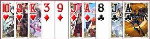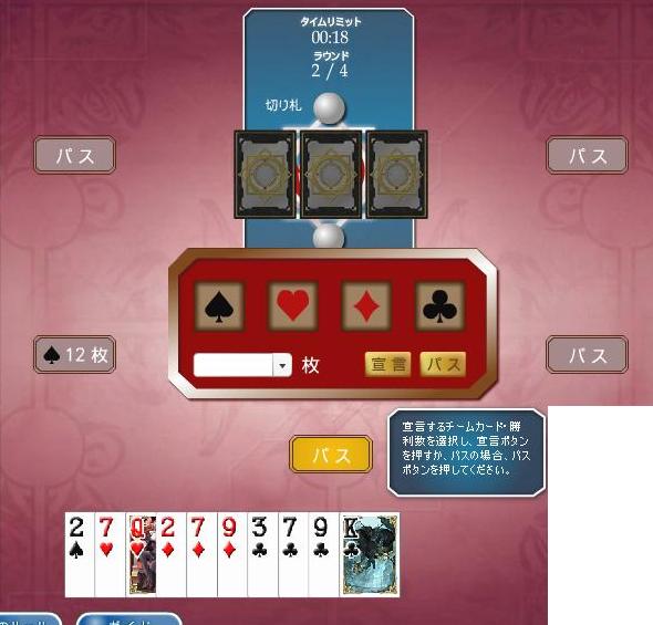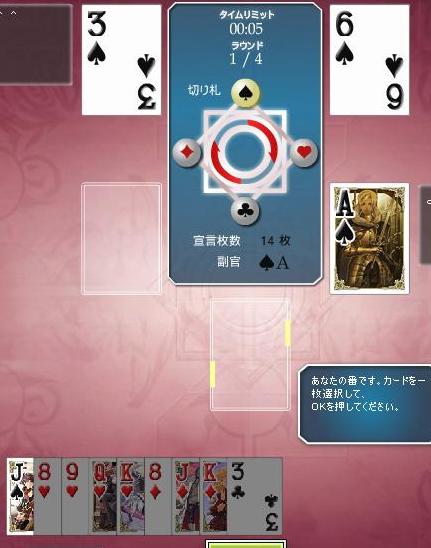 「順目」=5人がカードを1枚ずつ出すその回 「局」=ラウンド 「半荘」=ゲーム全体 「卓」=部屋 「同卓」=同じ部屋でプレイすること 「卓を立てる」=部屋の新規作成 「親」=ナポレオンのプレーヤー 「子」=副官+連合のプレーヤー 「起家」=部屋を作ったプレーヤー(第1ラウンドで一番最初にナポ宣言をするので) 「上家」「下家」=自分の右、左のプレーヤー、対面は2人いるので「右対面」「左対面」という 「連荘」=連続でナポになること 「配牌」=最初に配られたカード 「ツモ」=ナポレオンが宣言後に取る3枚のカード 「チョンチョン」=ナポレオンが宣言後に取る3枚のカード(親だけ配牌が多いという観点から) 「捨て牌」=切ったカード、あるいはナポレオンが宣言後に交換して捨てたカード 「海底」=10順目、狭義に10順目の最後の出し順のプレーヤーの出したカード 「対子」「暗刻」=同じ数のカードが2種類3種類あること、2やジャックに用いられる 「オタ風」=平札、つまり切り札ではないスート、台札を含めないこともある 「トップ目」=まだ終了していない状態での1位 「ドラ」=正ジャック、裏ジャック(切り札によって価値が変わるところがドラ表示牌によって価値が変わるのと類似) 応用編 「三味線」=チャットで嘘などを言うこと 「テンパネ」=18~20ボーナス 「絶一門」=少ない枚数のスートを切ることでそのスートのカードを無くすこと 「足引き」=ナポが負けることで副官にも点が入らないこと、「巻き込み」と同義 「トリガミ」=副官で勝った際、ナポに4点の差をつけられること 「龍ならな~」=最善を尽くすも結果的に悪手である手 「嶋田さん」=ハートの12でナポ宣言すること 先日のナポ。図のような配牌がキタ。マイティもジョーカーもなくジャックも無い上に色の方よりも無い。まぁクズ配牌である。 のだが自分の左が12枚で宣言し、それ以外がみんなパス。つまり自分が立たないとそのまま12という低宣言が通ってしまうことになる。しかしこの配牌である。さすがの俺でも宣言できずにパス。結果12枚で通り、そのまま負けた。 ナポが決まった直後のこと、自分のふたつ右のプレーヤーが名指しで「12で通すのは素人」とか抜かしてきた。はあ?だったら自分で吊り上げろよ!みんなギリギリのところで勝負してんだよ! アルテイルの場合、ぐるぐる温泉という洗練された場があった以上、稼動初期の段階で上級者が多々いる。なのだがそれは初心者が入りにくいということにもつながっている。実際最近初心者はだいぶ減った。それはこういった温泉経験者等ナポに慣れているプレーヤーで暴言吐くプレーヤーがどんどん初心者を萎えさせていったからのように思える。どうにかしないと先は無いのかもしれないと思うとゾッとするが、、、。 追記 結局、自分のふたつ左のプレーヤーが副官だったのだがマイティ、ジョーカー、裏ジャックのすべてを持っていた。(偽ジャックも1枚)。そのプレーヤーが立たないんならそりゃ誰も立たないよな。見たところそのプレーヤーは初心者。ナポになるのが怖くてで回避したのだと思う。以前ナポになって負けて暴言吐かれたんだろう、、、。