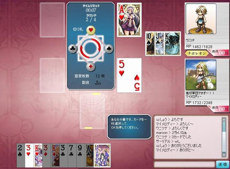 これが店長との最初のやりとりなのだが、非常に感銘を受けた。第一印象は人を決めるとはよく言ったものである。 先日のナポ。ナポレオンが砂さんで俺はジョーカー指名の副官。その1順目、砂さんは絵札3枚捨てで切り札であるハートのAをリード。 絵札を3枚捨てている以上、この順目はナポが確実にの取れる算段がある順目である。ハートAよりも強いカードはマイティ、ジョーカー、正ジャック、裏ジャックの4枚がある。(1順目セイム2はなし)。リードがハートなので事故が起きない限りマイティと裏ジャックは出てこない。ジョーカーは副官指名札。この時点では正ジャックを連合に出されると取られてしまうが「勝てる算段がある」わけなので、正ジャックも砂さんが持っていると読める。 さて俺の手牌。ハートは3とK。またジョーカーも出すことが出来る。正ジャックをナポが持っている以上ジョーカーをかぶせる手は無い。ハート3とハートKの選択だが、「絵札をナポに乗せる」「ハートKという比較的強いカードを葬る」という観点から最善手はハートK。結局この局はナポレオン軍が勝った。 結果的にはハートKが最善手なのだが、「砂さんに絵札を乗せる」という行為はいささか屈辱的である、麻雀で例えると残り900点のヤツを抱える2着目の流局時にそいつがノーテンなので倒せないという状況か。