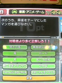 年明けの瞬間はクイズをして迎えたが家の近くのゲーセンの閉店時間である4時と、グランドクロスの置いてある甲府のゲーセンの開店時間の10時を埋めるためになきむしいちごへ。4麻の卓は立ってなく、3麻の卓が立っていた。抜け番を作ることで4人でも出来るルールとのことで打つことが出来た。 正月と言うと「お年玉」とかいってレートが上がるのが普通だが、ここでは逆に普段はピンなのに点5に下がっていた。しかし慣れていないルールだったこともあり完全に力負け。新年初チョンボ(888s4455566789pから9pツモ)を含めそこそこ負けた。この成績でマイナス10000万というのはまさにルールに助けられた感じである。ある意味お年玉獲得。