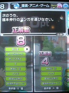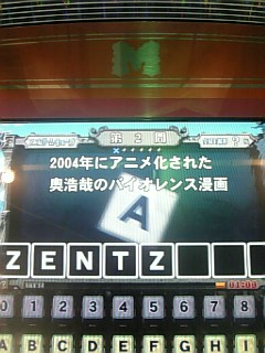 それに対する稲葉の感想。「マゾの俺にはたまんね~!」 漫アゲ積み重ね、答えは「アガギ」「天」「賭博黙示録カイジ」「銀と金」「無頼伝涯」「熱いぜ辺ちゃん」「熱いぜ天馬」「見上げれば通天閣」(間違い選択肢にかわぐちかいじの「はっぽうやぶれ」)←好きな順 麻雀系、ギャンブル系の福本漫画はホント面白いよな。大学行き始めた頃(98年)に読み始めたけど、その頃の作品は最高だと思う。ちなみにカイジはEカード、アカギは鷲津編1半荘目、天は2人麻雀オーラス、からそれぞれ読み始めた。 ただ、最近の引き伸ばし傾向はかなり微妙、、、。アカギはもう10年も鷲津とやってるし。カイジも3作すべて13巻まで出ているが、1作目=4ギャンブル(限定ジャンケン、鉄骨渡り、Eカード、ティッシュくじ)、2作目=2ギャンブル(チンチロ、沼)、3作目=1ギャンブル(17歩)とどんどん半減している。つまり指数関数的に引き伸ばしているということで、次回作は1/2個しかしなさそう。 辺ちゃんや天の初期のような人情モノも読んでみると結構面白い。この問題には無いが黒沢が一番好き。次点は黒ワニ。 さて、最近始まった「零」。今連載している物の中では一番期待している。少年誌連載だから佐原や石田をバッタバッタ殺したカイジのようには出来ないだろうが、楽しみにはしている。
