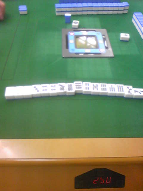 最近この店は常連でない客が多いが、この日も対戦3プレーヤーのうち2人が初顔合わせだった。が、上家のプレーヤーが無発声癖。一度無発声で槓されて、無発声でリンシャンツモなんてこともあった。(さらにテンパネの計算ができないようで800-1600なのに700-1300と言っていた)。それに対抗して俺もA氏の様にリーチ後無発声でカンドラをめくったりしてみようかと思ったが、まぁそれも大人気ないと思いやめといた。結果はこのプレーヤーが(1度国士に刺さってたようだけど)バカ勝ち。俺の結果は1-1-2-0のプラス1100円(場代800円)。牌勢は良くなかったが、下手な振込みがなかったので大惨事には至らず。 2334556s556688p。タンヤオだが、場は平和場というより対子場みたいな感じだった。このあと4s引きでひとまず2p待ちに受ける。で、5sを持ってきた。白マイティ(4枚チートイあり)なら文句なく2p切りだがこのルールだとツモ切るしかない。このあとリャンペーコーを視野に入れつつ8m単騎の仮テンに受けてたらひょっこりツモった。8000オールの400円。 2367p23478s4599mツモ4p。58pか69sか36mの面子選択である。普通なら内側の36mを嫌うところだが、8pが2枚切れていたので58pを嫌ってみた。次順6mツモ。読みが冴えたな~とか思いつつホクホクしながらリーチを打った。しかし一発目で5pツモ。78s切りが正解だった。ちなみにこの局は横移動(前述の国士)で終了。