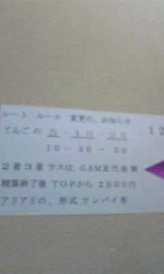 × [PR]上記の広告は3ヶ月以上新規記事投稿のないブログに表示されています。新しい記事を書く事で広告が消えます。 なきむちいちごのオカとゲーム代が変更になった。2位が500円貰い、3位が1500円払い、4位が2500円払いで、1位は3500円貰いだが、ここから2000円をゲーム代として出す。つまりゲーム代が500円で、1位+2000円、2位+1000円、3位-1000円、4位-2000円。もともと1000-2000なので精算が後払いになっただけで、レートは上がってない。ただゲーム代が上がっただけである。 が「来店するだけで1000円もらえる」というサービスがある。ということは10半荘までならばかえってゲーム代は安くなる。さらには3000円で「(1日1枚限定だが)2回ゲーム券4枚」が買えるというサービスが始まった。16時までの来店で1ゲームサービスも継続とのこと。 これ長く打てば打つほど損をするのでは?10半荘打ったら次の回は無料とかなら他の店でもやっていおるが、最初に無料になるのはなかなか斬新である。俺のように4~5回も打ったら十分というプレーヤーには助かるが。あとこのシステム。メンバーが死んでゆくのではないかと思う。月間200半荘打った場合、単純に2万円の収入減である。アルバイターにとって2万は大きい。大丈夫かな? さて、今後について。前述のゲーム券は当然購入した上に役満を上がったので手元に4枚ある。あと三が日に来店するとゲーム券を5枚くれるんだそうだ。ゲーム券を持っているときは4半荘までが無料となる。ということはあと9回は店にゲーム代を落とさないことになる。フリードリンクの種類も増えたし自分にとってはいいことづくめだが、店の安否は気になる。