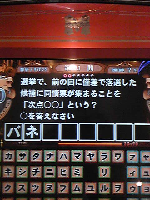 さてこの日の麻雀。とにかく染めた局が多かった。配牌で「2348899+字牌対子」なんて手が来たが、特に8899のところは鳴かないと処分できない。鳴いて染めざるを得ない局が多く、それでいて3900程度にしかならないとか、手が狭まったところで他家の攻撃が入り四苦八苦なんて感じの展開だった。 うまくいった局は2局だけ。まずは1半荘目の東1局。取り合えず役牌を鳴いて、赤含みで12000のロン。けれど次局にリーチ一発のハネマンを振り込んでしまいトントン。2位で終了。 その後3位3位と来たが、4半荘目の東風の親。グダグダに鳴いて辺3m待ちが残った。一応ドラを抱えていて18300点のテンパイ。2軒リーチが入ったが、18200しかないプレーヤーから出てラスト。点棒的にも3位→1位の移動で大助かり。 結果は1-1-2-0でプラス1900円(場代1600円)。厳しい牌勢ながら、負けなかったのは良かった。「ラス引いたら無料券を使う」としているが、今回の使用はなく、残り12枚。 まだ花梨でフリーをやってたときのこと、龍+稲葉+俺+親久保さんという卓が立った。稲葉が龍から祝儀のつく和了をしたが、龍はゴネて払わなかった。 1局ほど過ぎた後、稲葉が突如立ち上がり龍の胸倉をつかみだした。仕方なく俺は止めに入ったが、2人とも何やってんだか、、、。払わない龍が一番悪いのだが、第3者(店員が理想)をはさまないで自分で解決しようとする稲葉の対応も悪い。 その後はメチャクチャ雰囲気が悪くなり、重い時間が過ぎていった。そんな中きっちりトップをとっていった親久保さんは強い。天5巻、東西戦予選でアカギや曽我が牌を拾い四暗刻を上がったのに対し、「こんな状況でよく平然としていられるな」という話があるがそれを思わせる。 雑学タイピング、答えは「バネ」 選挙において「デュヴェルジェの法則」という法則がある。m人が当選する選挙において、候補者数はm+1人に収束するという法則である。当落線以上の票が見込まれる候補者に投票しようとする人は、自分が投票しなくても当選するので次善の候補に投票する。逆に当落線以下の票しか取れなそうな候補者に投票しようとする人は、自分の票が無駄になってしまうのを回避するために、当落線上の候補に投票しようとする。それが「デュヴェルジェの法則」で、派生理論として前回ギリギリで落選した候補に票が集まるというのがあり、それを「次点バネ」という。 票がちょっと増えるというのが麻雀の「テンパネ」に似てて、俺にとっては非常に覚えやすいと思った。